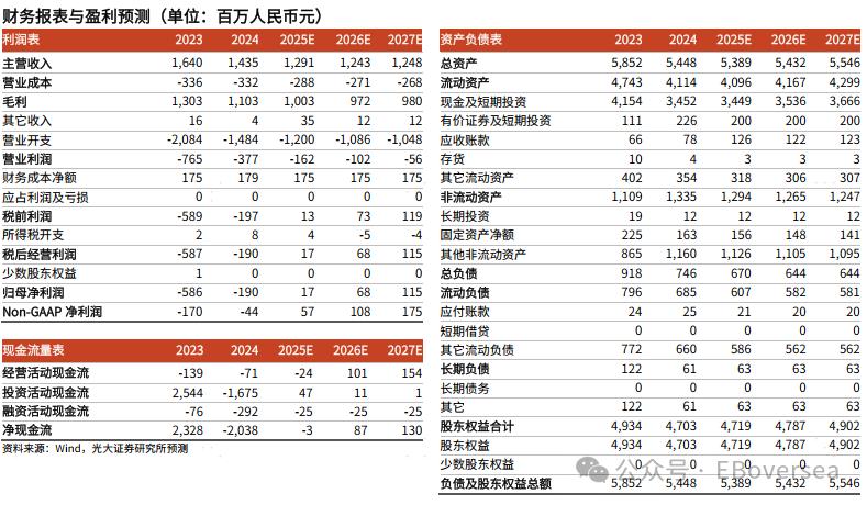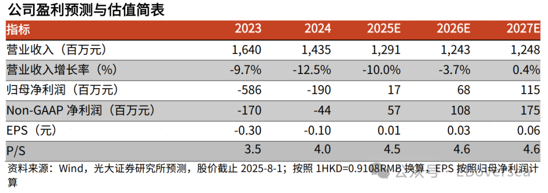 24年收入业绩情况:24年公司收入14.35亿元,同比下滑12.5%,实现经调整净亏损0.4亿元(vs23年亏损1.7亿元),亏损收窄主要系费用大幅压降,24年公司整体费用为14.84亿元,同比下降28.8%,销售费用/管理费用/研发费用分别下滑17.8%/53.0%/25.0%,公司自21 年起逐步压缩人员规模,从21年的4247人减少至2024年底的1912人,预计至25年中期,人员将进一步降至1600–1700人之间